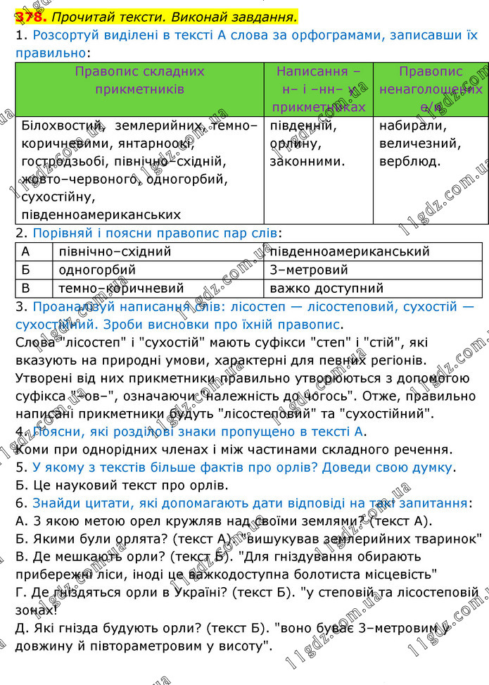 Прочитай тексти. Виконай завдання. 1. Розсортуй виділені в тексті А слова за орфограмами, записавши їх правильно: Правопис складних прикметників Написання –н– і –нн– у прикметниках Правопис ненаголошених е/и Білохвостий, землерийних, темно–коричневими, янтарноокі, гостродзьобі, північно–східній, жовто–червоного, одногорбий, сухостійну, південноамериканських південній, орлину, законними. набирали, величезний, верблюд. 2. Порівняй і поясни правопис пар слів: А північно–східний південноамериканський Б одногорбий 3–метровий В темно–коричневий важко доступний 3. Проаналізуй написання слів: лісостеп — лісостеповий, сухостій — сухостійний. Зроби висновки про їхній правопис. Слова "лісостеп" і "сухостій" мають суфікси "степ" і "стій", які вказують на природні умови, характерні для певних регіонів. Утворені від них прикметники правильно утворюються з допомогою суфікса "–ов–", означаючи "належність до чогось". Отже, правильно написані прикметники будуть "лісостеповий" та "сухостійний". 4. Поясни, які розділові знаки пропущено в тексті А. Коми при однорідних членах і між частинами складного речення. 5. У якому з текстів більше фактів про орлів? Доведи свою думку. Б. Це науковий текст про орлів. 6. Знайди цитати, які допомагають дати відповіді на такі запитання: А. 3 якою метою орел кружляв над своїми землями? (текст А). Б. Якими були орлята? (текст А). "вишукував землерийних тваринок" В. Де мешкають орли? (текст Б). "Для гніздування обирають прибережні ліси, іноді це важкодоступна болотиста місцевість" Г. Де гніздяться орли в Україні? (текст Б). "у степовій та лісостеповій зонах! Д. Які гнізда будують орли? (текст Б). "воно буває 3–метровим у довжину й півтораметровим у висоту".