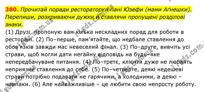 Прочитай поради рестораторки пані Юзефи (мами Аґнешки). Перепиши, розкриваючи дужки й ставлячи пропущені розділові знаки. (1) Друзі, пропоную вам кілька нескладних порад для роботи в ресторані. (2) По–перше, пам’ятайте, що недбале ставлення до обов’язків завжди мас невеселий фінал. (3) По–друге, вивчіть усі страви, щоб могли дати негайну відповідь на будь–яке непередбачуване питання. (4) По–третє, клієнти дуже не люблять неприязне ставлення до себе. (5) По–четверте, деякі недешеві страви потрібно подавати не гарячими, а холодними, а деякі – навпаки. (6) Але найважливіше – це любити свою непросту роботу.
