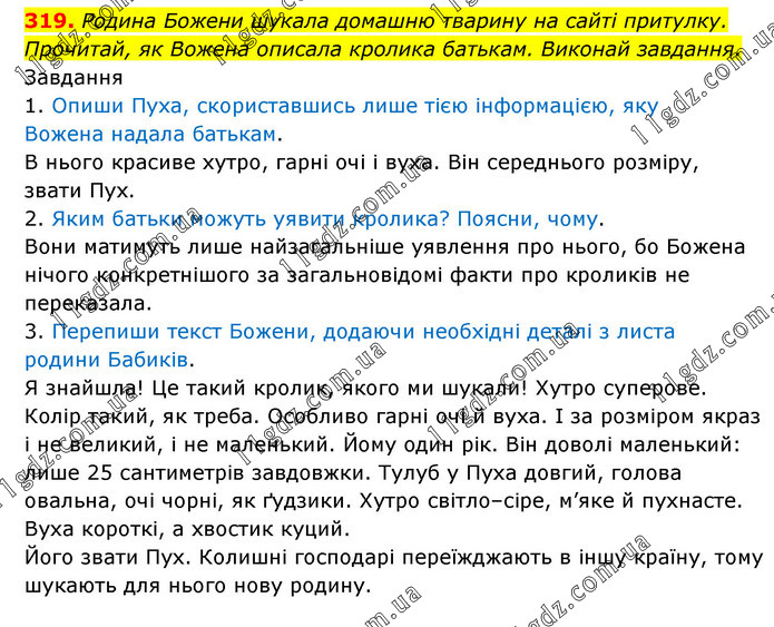 Родина Божени шукала домашню тварину на сайті притулку. Прочитай, як Вожена описала кролика батькам. Виконай завдання. Завдання 1. Опиши Пуха, скориставшись лише тією інформацією, яку Вожена надала батькам. В нього красиве хутро, гарні очі і вуха. Він середнього розміру, звати Пух. 2. Яким батьки можуть уявити кролика? Поясни, чому. Вони матимуть лише найзагальніше уявлення про нього, бо Божена нічого конкретнішого за загальновідомі факти про кроликів не переказала. 3. Перепиши текст Божени, додаючи необхідні деталі з листа родини Бабиків. Я знайшла! Це такий кролик, якого ми шукали! Хутро суперове. Колір такий, як треба. Особливо гарні очі й вуха. І за розміром якраз і не великий, і не маленький. Йому один рік. Він доволі маленький: лише 25 сантиметрів завдовжки. Тулуб у Пуха довгий, голова овальна, очі чорні, як ґудзики. Хутро світло–сіре, м’яке й пухнасте. Вуха короткі, а хвостик куций. Його звати Пух. Колишні господарі переїжджають в іншу країну, тому шукають для нього нову родину.