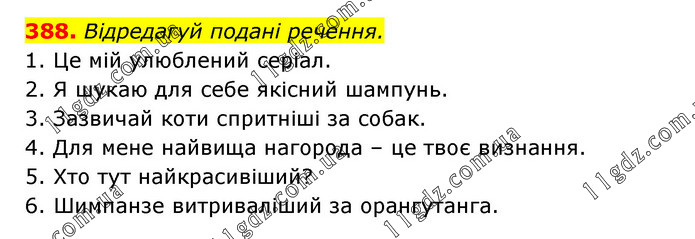Відредагуй подані речення. 1. Це мій улюблений серіал. 2. Я шукаю для себе якісний шампунь. 3. Зазвичай коти спритніші за собак. 4. Для мене найвища нагорода – це твоє визнання. 5. Хто тут найкрасивіший? 6. Шимпанзе витриваліший за орангутанга.