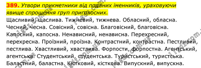 Утвори прикметники від поданих іменників, ураховуючи явище спрощення груп приголосних. Щасливий, щаслива. Тижневий, тижнева. Обласний, обласна. Чесний, чесна. Совісний, совісна. Благовісний, благовісна. Капосний, капосна. Ненависний, ненависна. Перехресний, перехресна. Проїзний, проїзна. Контрастний, контрастна. Пестливий, пестлива. Хвастливий, хвастлива. Форпости, форпостна. Агентський, агентська. Студентський, студентська. Туристський, туристська. Баластний, баластна. Кістковий, кісткова. Випускний, випускна.