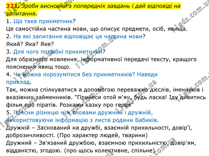 Зроби висновки з попередніх завдань і дай відповіді на запитання. 1. Що таке прикметник? Це самостійна частина мови, що описує предмети, осіб, явища. 2. На які запитання відповідає ця частина мови? Який? Яка? Яке? 3. Для чого потрібні прикметники? Для образного мовлення, інформативної передачі тексту, кращого пояснення явищ тощо. 4. Чи можна порозумітися без прикметників? Наведи приклад. Так, можна спілкуватися а допомогою переважно дієслів, іменників і вказівних займенників. "Принеси отой м'яч, будь ласка! Іду дивитись фільм про піратів. Розкажи казку про героя" 5. Поясни різницю між словами дружний і дружній, використовуючи інформацію з листа родини Бабиків. Дружній – Заснований на дружбі, взаємній прихильності, довір'ї, доброзичливості. (Про характер людей, тварини) Дружний – Зв'язаний дружбою, взаємною прихильністю, довір'ям, відданістю, згодою. (про щось колективне, спільне)