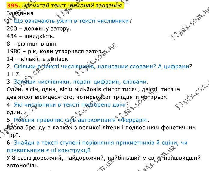 Прочитай текст. Виконай завдання. Завдання 1. Що означають ужиті в тексті числівники? 200 – довжину затору. 434 – швидкість. 8 – різниця в ціні. 1980 – рік, коли утворився затор. 14 – кількість автівок. 2. Скільки в тексті числівників, написаних словами? А цифрами? 1 і 7. 3. Запиши числівники, подані цифрами, словами. Один, вісім, один, вісім мільйонів сімсот тисяч, двісті, тисяча дев'ятсот вісімдесятого, чотирьохсот тридцяти чотирьох 4. Які числівники в тексті повторено двічі? один. 5. Поясни правопис слів автокомпанія «Феррарі». Назва бренду в лапках з великої літери і подвоєнням фонетичним "рр". 6. Знайди в тексті ступені порівняння прикметників й оціни, чи правильними є ці конструкції. У 8 разів дорожчий, найдорожчий, найбільший у світі, найшвидший автомобіль.