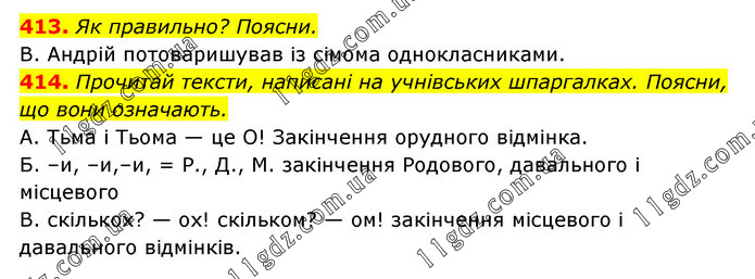 413. Як правильно? Поясни. В. Андрій потоваришував із сімома однокласниками. 414. Прочитай тексти, написані на учнівських шпаргалках. Поясни, що вони означають. А. Тьма і Тьома — це О! Закінчення орудного відмінка. Б. –и, –и,–и, = Р., Д., М. закінчення Родового, давального і місцевого В. скількох? — ох! скільком? — ом! закінчення місцевого і давального відмінків.