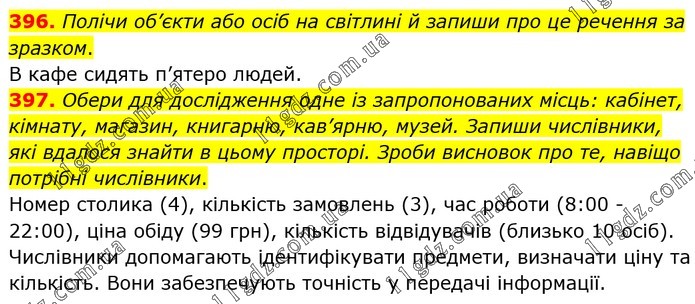 396. Полічи об’єкти або осіб на світлині й запиши про це речення за зразком. В кафе сидять п’ятеро людей. 397. Обери для дослідження одне із запропонованих місць: кабінет, кімнату, магазин, книгарню, кав’ярню, музей. Запиши числівники, які вдалося знайти в цьому просторі. Зроби висновок про те, навіщо потрібні числівники. Номер столика (4), кількість замовлень (3), час роботи (8:00 - 22:00), ціна обіду (99 грн), кількість відвідувачів (близько 10 осіб). Числівники допомагають ідентифікувати предмети, визначати ціну та кількість. Вони забезпечують точність у передачі інформації.