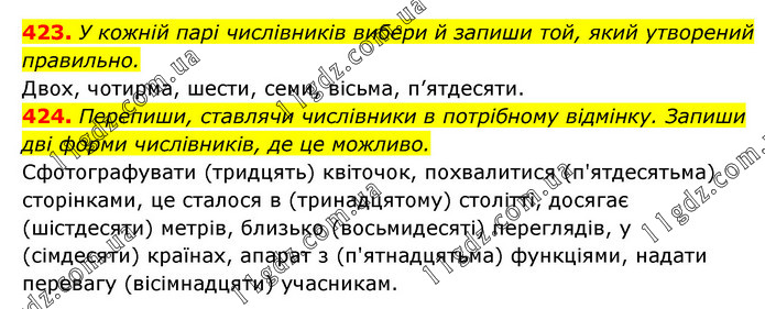 423. У кожній парі числівників вибери й запиши той, який утворений правильно. Двох, чотирма, шести, семи, вісьма, п’ятдесяти. 424. Перепиши, ставлячи числівники в потрібному відмінку. Запиши дві форми числівників, де це можливо. Сфотографувати (тридцять) квіточок, похвалитися (п'ятдесятьма) сторінками, це сталося в (тринадцятому) столітті, досягає (шістдесяти) метрів, близько (восьмидесяті) переглядів, у (сімдесяти) країнах, апарат з (п'ятнадцятьма) функціями, надати перевагу (вісімнадцяти) учасникам.