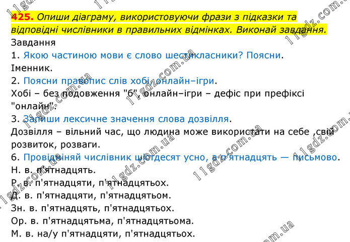Опиши діаграму, використовуючи фрази з підказки та відповідні числівники в правильних відмінках. Виконай завдання. Завдання 1. Якою частиною мови є слово шестикласники? Поясни. Іменник. 2. Поясни правопис слів хобі, онлайн–ігри. Хобі – без подовження "б", онлайн–ігри – дефіс при префіксі "онлайн". 3. Запиши лексичне значення слова дозвілля. Дозвілля – вільний час, що людина може використати на себе ,свій розвиток, розваги. 6. Провідміняй числівник шістдесят усно, а п’ятнадцять — письмово. Н. в. п'ятнадцять. Р. в. п'ятнадцяти, п'ятнадцятьох. Д. в. п'ятнадцяти, п'ятнадцятьом. Зн. в. п'ятнадцять, п'ятнадцятьох. Ор. в. п'ятнадцятьма, п'ятнадцятьома. М. в. на/у п'ятнадцяти, п'ятнадцятьох.