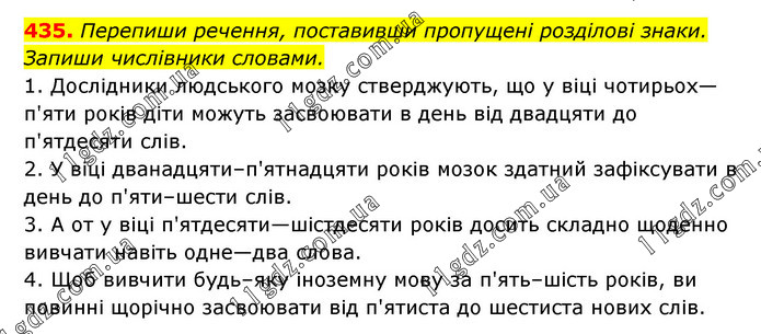 Перепиши речення, поставивши пропущені розділові знаки. Запиши числівники словами. 1. Дослідники людського мозку стверджують, що у віці чотирьох—п'яти років діти можуть засвоювати в день від двадцяти до п'ятдесяти слів. 2. У віці дванадцяти–п'ятнадцяти років мозок здатний зафіксувати в день до п'яти–шести слів. 3. А от у віці п'ятдесяти—шістдесяти років досить складно щоденно вивчати навіть одне—два слова. 4. Щоб вивчити будь–яку іноземну мову за п'ять–шість років, ви повинні щорічно засвоювати від п'ятиста до шестиста нових слів.