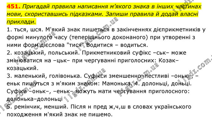 Пригадай правила написання м’якого знака в інших частинах мови, скориставшись підказками. Запиши правила й додай власні приклади. 1. ться, шся. М'який знак пишеться в закінченнях дієприкметників у формі минулого часу (теперішнього доконаного) при утворенні з ними форм дієслова "тися" Водитися – водиться. 2. козацький, польський. Прикметниковий суфікс –ськ– може змінюватися на –цьк– при чергуванні приголосних: Козак–козацький. 3. маленький, голівонька. Суфікси зменшенно–пестливі –оньк–, –еньк пишуться з м'яким знаком: Мамонька. 4. долоньці, доньці. Суфіки –оньк–, –еньк– можуть мати чергування приголосного: долонька–долоньці 5. ремінчик, менший. Після н перед ж, ч, ш в словах українського походження м'який знак не пишемо.