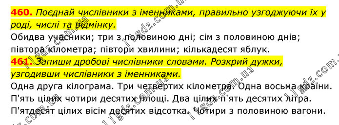 460. Поєднай числівники з іменниками, правильно узгоджуючи їх у роді, числі та відмінку. Обидва учасники; три з половиною дні; сім з половиною днів; півтора кілометра; півтори хвилини; кількадесят яблук. 461. Запиши дробові числівники словами. Розкрий дужки, узгодивши числівники з іменниками. Одна друга кілограма. Три четвертих кілометра. Одна восьма країни. П'ять цілих чотири десятих площі. Два цілих п'ять десятих літра. П'ятдесят цілих вісім десятих відсотка. Чотири з половиною вагони.