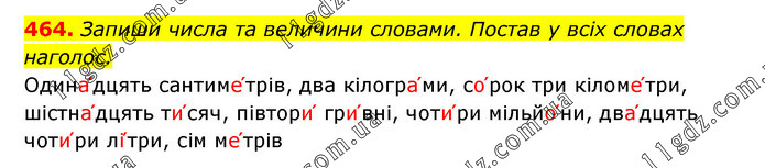 Запиши числа та величини словами. Постав у всіх словах наголос. Одина՛дцять сантиме՛трів, два кілогра՛ми, со՛рок три кіломе՛три, шістна՛дцять ти՛сяч, півтори՛ гри՛вні, чоти՛ри мільйо՛ни, два՛дцять чоти՛ри лі՛три, сім ме՛трів