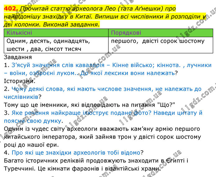 Прочитай статтю археолога Лео (тата Аґнешки) про найвідомішу знахідку в Китаї. Випиши всі числівники й розподіли у дві колонки. Виконай завдання. Кількісні Порядкові Одним, десять, одинадцять, шести , два, сімсот тисяч першого, двісті сорок шостому Завдання 1. З’ясуй значення слів кавалерія – Кінне військо; кіннота. , лучники – воїни, озброєні луком.. До якої лексики вони належать? Історизми. 2. Чому деякі слова, які мають числове значення, не належать до числівників? Тому що це іменники, які відповідають на питання "Що?" 3. Яке речення найкраще ілюструє подане фото? Наведи цитату й поясни свою думку. Одним із чудес світу археологи вважають кам’яну армію першого китайського імператора, який зайняв трон у двісті сорок шостому році до нашої ери. 4. Про які ще знахідки археологів тобі відомо? Багато історичних реліквій продовжують знаходити в Єгипті і Туреччині. Це кімнати фараонів і візантійські храми.