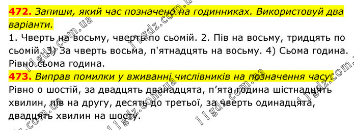 472. Запиши, який час позначено на годинниках. Використовуй два варіанти. 1. Чверть на восьму, чверть по сьомій. 2. Пів на восьму, тридцять по сьомій. 3) За чверть восьма, п'ятнадцять на восьму. 4) Сьома година. Рівно сьома година. 473. Виправ помилки у вживанні числівників на позначення часу. Рівно о шостій, за двадцять дванадцята, п’ята година шістнадцять хвилин, пів на другу, десять до третьої, за чверть одинадцята, двадцять хвилин на шосту.