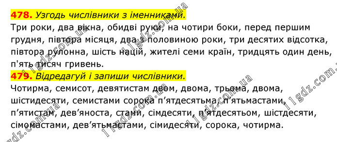 478. Узгодь числівники з іменниками. Три роки, два вікна, обидві руки, на чотири боки, перед першим грудня, півтора місяця, два з половиною роки, три десятих відсотка, півтора рулонна, шість націй, жителі семи країн, тридцять один день, п'ять тисяч гривень. 479. Відредагуй і запиши числівники. Чотирма, семисот, девятистам двом, двома, трьома, двома, шістидесяти, семистами сорока п’ятдесятьма, п’ятьмастами, п’ятистам, дев’яноста, стами, сімдесяти, п’ятдесятьом, шістдесяти, сімомастами, дев’ятьмастами, сімидесяти, сорока, чотирма.