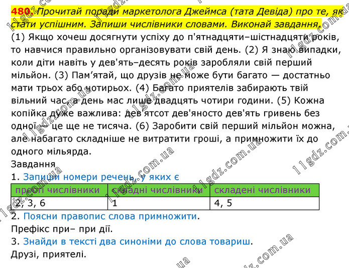 Прочитай поради маркетолога Джеймса (тата Девіда) про те, як стати успішним. Запиши числівники словами. Виконай завдання. (1) Якщо хочеш досягнути успіху до п'ятнадцяти–шістнадцяти років, то навчися правильно організовувати свій день. (2) Я знаю випадки, коли діти навіть у дев'ять–десять років заробляли свій перший мільйон. (3) Пам’ятай, що друзів не може бути багато — достатньо мати трьох або чотирьох. (4) Багато приятелів забирають твій вільний час, а день мас лише двадцять чотири години. (5) Кожна копійка дуже важлива: дев'ятсот дев'яносто дев'ять гривень без одної — це ще не тисяча. (6) Заробити свій перший мільйон можна, але набагато складніше не витратити гроші, а примножити їх до одного мільярда. Завдання 1. Запиши номери речень, у яких є прості числівники складні числівники складені числівники 2, 3, 6 1 4, 5 2. Поясни правопис слова примножити. Префікс при– при дії. 3. Знайди в тексті два синоніми до слова товариш. Друзі, приятелі.
