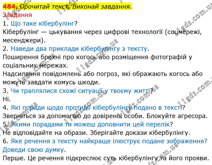 Прочитай текст. Виконай завдання. Завдання 1. Що таке кібербулінг? Кібербулінг — цькування через цифрові технології (соцмережі, месенджери). 2. Наведи два приклади кібербулінгу з тексту. Поширення брехні про когось або розміщення фотографій у соціальних мережах. Надсилання повідомлень або погроз, які ображають когось або можуть завдати комусь шкоди. 3. Чи траплялися схожі ситуації у твоєму житті? Ні. 4. Які поради щодо протидії кібербулінгу подано в тексті? Зверніться за допомогою до довіреної особи. Блокуйте агресора. 5. Якими порадами ти можеш доповнити цей перелік? Не відповідайте на образи. Зберігайте докази кібербулінгу. 6. Яке речення з тексту найкраще ілюструє подане зображення? Доведи свою думку. Перше. Це речення підкреслює суть кібербулінгу та його прояви.
