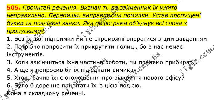 Прочитай речення. Визнач ті, де займенник їх ужито неправильно. Перепиши, виправляючи помилки. Устав пропущені букви та розділові знаки. Яка орфограма об’єднує всі слова з пропусками? 1. Без їхньої підтримки ми не спроможні впоратися з цим завданням. 2. Потрібно попросити їх прикрутити полиці, бо в нас немає інструментів. 3. Коли закінчиться їхня частина роботи, ми почнемо прибирати. 4. А ще я попросив би їх під’єднати вимикач. 5. Хтось бачив їхнє оголошення про відкриття нового офісу? 6. Було б доречно привітати їх із цією подією. Кома в складному реченні.