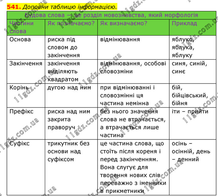Доповни таблицю інформацією. Будова слова — це розділ мовознавства, який морфологія Частини слова Як позначаємо? Як визначаємо? Приклад Основа риска під словом до закінчення відмінювання яблуко, яблука, яблуку Закінчення закінчення виділяють квадратом відмінювання, особові словозміни синя, синій, синє Корінь дугою над ним при відмінюванні і словозмінні ця частина немінна бій, бійцівський, бійня Префікс риска над ним закрита праворуч без нього значення слова не втрачається, а втрачається лише частина іти – прийти Суфікс трикутник без основи над суфіксом це частина слова, що стоїть після кореня і перед закінченням. Вона слугує для творення нових слів переважно з іменники в прикметники осінь – осінній, день – денний
