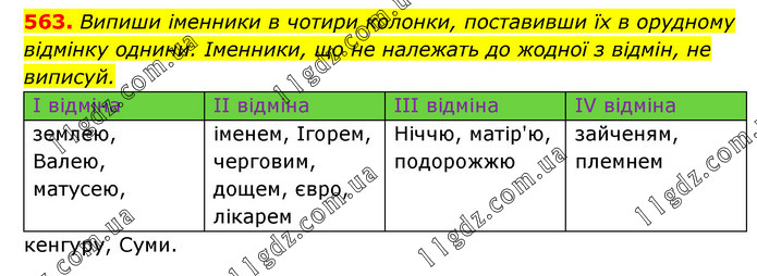 Випиши іменники в чотири колонки, поставивши їх в орудному відмінку однини. Іменники, що не належать до жодної з відмін, не виписуй. I відміна II відміна III відміна IV відміна землею, Валею, матусею, іменем, Ігорем, черговим, дощем, євро, лікарем Ніччю, матір'ю, подорожжю зайченям, племнем кенгуру, Суми.