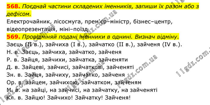 568. Поєднай частини складених іменників, запиши їх разом або з дефісом. Електрочайник, лісосмуга, прем'єр–міністр, бізнес–центр, відеопрезентація, міні–поїзд 569. Провідміняй подані іменники в однині. Визнач відміну. Заєць (ІІ в.), зайчиха (І в.), зайчатко (ІІ в.), зайченя (ІV в.). Н. в. Заєць, зайчиха, зайчатко, зайченя Р. в. Зайця, зайчихи, зайчатка, зайченяти Д. в. Зайцеві, зайчисі, зайчаткові, зайченяті Зн. в. Зайця, зайчиху, зайчатко, зайченя Ор. в. зайцем, зайчихою, зайчатком, зайченям М. в. на зайці, на зайчисі, на зайчатку, на зайченяті Кл. в. Зайцю! Зайчихо! Зайчатку! Зайченя!