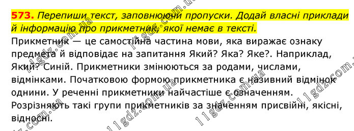 Перепиши текст, заповнюючи пропуски. Додай власні приклади й інформацію про прикметник, якої немає в тексті. Прикметник — це самостійна частина мови, яка виражає ознаку предмета й відповідає на запитання Який? Яка? Яке?. Наприклад, Який? Синій. Прикметники змінюються за родами, числами, відмінками. Початковою формою прикметника є називний відмінок однини. У реченні прикметники найчастіше є означенням. Розрізняють такі групи прикметників за значенням присвійні, якісні, відносні.