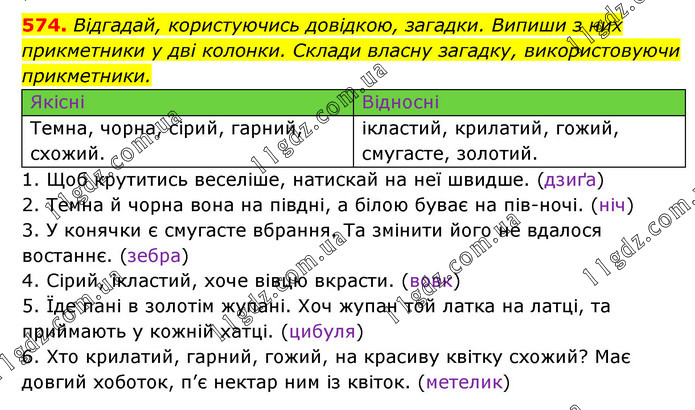 Відгадай, користуючись довідкою, загадки. Випиши з них прикметники у дві колонки. Склади власну загадку, використовуючи прикметники. Якісні Відносні Темна, чорна, сірий, гарний, схожий. ікластий, крилатий, гожий, смугасте, золотий. 1. Щоб крутитись веселіше, натискай на неї швидше. (дзиґа) 2. Темна й чорна вона на півдні, а білою буває на півночі. (ніч) 3. У конячки є смугасте вбрання. Та змінити його не вдалося востаннє. (зебра) 4. Сірий, ікластий, хоче вівцю вкрасти. (вовк) 5. Їде пані в золотім жупані. Хоч жупан той латка на латці, та приймають у кожній хатці. (цибуля) 6. Хто крилатий, гарний, гожий, на красиву квітку схожий? Має довгий хоботок, п’є нектар ним із квіток. (метелик)