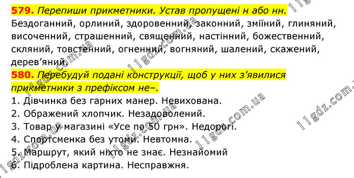 579. Перепиши прикметники. Устав пропущені н або нн. Бездоганний, орлиний, здоровенний, законний, зміїний, глиняний, височенний, страшенний, священний, настінний, божественний, скляний, товстенний, огненний, вогняний, шалений, скажений, дерев’яний. 580. Перебудуй подані конструкції, щоб у них з’явилися прикметники з префіксом не–. 1. Дівчинка без гарних манер. Невихована. 2. Ображений хлопчик. Незадоволений. 3. Товар у магазині «Усе по 50 грн». Недорогі. 4. Спортсменка без утоми. Невтомна. 5. Маршрут, який ніхто не знає. Незнайомий 6. Підроблена картина. Несправжня.