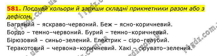 Поєднай кольори й запиши складні прикметники разом або з дефісом. Багряний – яскраво-червоний. Беж – ясно-коричневий. Бордо – темно–червоний. Бурий – темно–коричневий. Бірюзовий – синьо–зелений. Електрик – сіро–голубий. Теракотовий – червона–коричневий. Хакі – сірувато–зелений.
