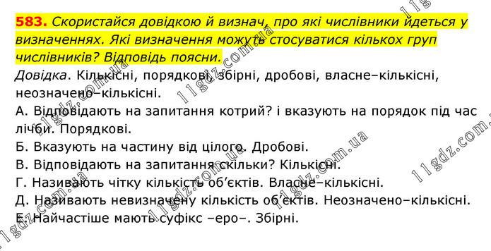 Скористайся довідкою й визнач, про які числівники йдеться у визначеннях. Які визначення можуть стосуватися кількох груп числівників? Відповідь поясни. Довідка. Кількісні, порядкові, збірні, дробові, власне–кількісні, неозначено–кількісні. А. Відповідають на запитання котрий? і вказують на порядок під час лічби. Порядкові. Б. Вказують на частину від цілого. Дробові. В. Відповідають на запитання скільки? Кількісні. Г. Називають чітку кількість об’єктів. Власне–кількісні. Д. Називають невизначену кількість об’єктів. Неозначено–кількісні. Е. Найчастіше мають суфікс –еро–. Збірні.