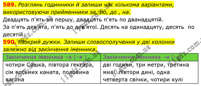 589. Розглянь годинники й запиши час кількома варіантами, використовуючи прийменники за, по, до , на. Двадцять п'ять на першу, двадцять п'ять по дванадцятій. За п'ять дев'ята, п'ять до дев'ятої. Десять на одинадцяту, десять по десятій. 590. Розкрий дужки. Запиши словосполучення у дві колонки залежно від закінчення іменника. Закінчення іменника –а (–я ) Закінчення іменника –и (–і) чотири Сашка, півтора гектара, сім восьмих каната, половина вагона дві години, три метри, третина милі, півтори дині, одна четверта свічки, чотири кулі