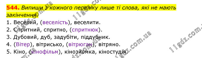 Випиши з кожного переліку лише ті слова, які не мають закінчення. 1. Веселий, (веселість), веселити. 2. Спритний, спритно, (спритнюк). 3. Дубовий, дуб, задубіти, піддубник. 4. (Вітер), вітрисько, (вітрюган), вітряно. 5. Кіно, (кінофільм), кінозйомка, кіностудія.