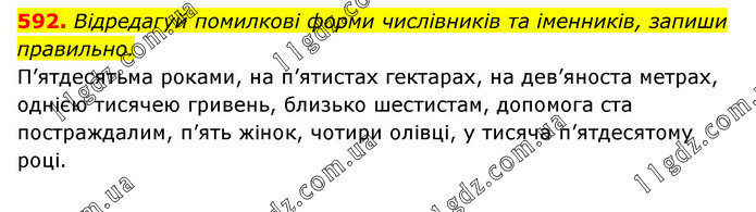 Відредагуй помилкові форми числівників та іменників, запиши правильно. П’ятдесятьма роками, на п’ятистах гектарах, на дев’яноста метрах, однією тисячею гривень, близько шестистам, допомога ста постраждалим, п’ять жінок, чотири олівці, у тисяча п’ятдесятому році.