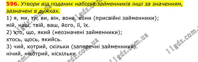 Утвори від поданих наборів займенників інші за значенням, зазначені в дужках. 1) я, ми, ти, ви, він, вона, вони (присвійні займенники); мій, наш, твій, ваш, його, її, їх. 2) хто, що, який (неозначені займенники); хтось, щось, якийсь. 3) чий, котрий, скільки (заперечні займенники). нічий, нікотрий, ніскільки.