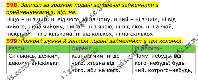 598. Запиши за зразком подані заперечні займенники з прийменниками з, від, на. Ніщо – ні з чим, ні від чого, ні на чому, нічий – ні з чиїм, ні від чийого, ні на чийому, ніяка – ні з якою, ні від якої, ні на якій, ніскільки – ні з кількома, ні від кількох, ні на скількох 599. Розкрий дужки й запиши подані займенники в три колонки. Разом Окремо Із дефісом Скількись, деяким, декому, аніскільки казна з чим, ні до чого, хтозна від чого, аби на кого, Чому–небудь, від кого–небудь, будь–чий, котрого–небудь,