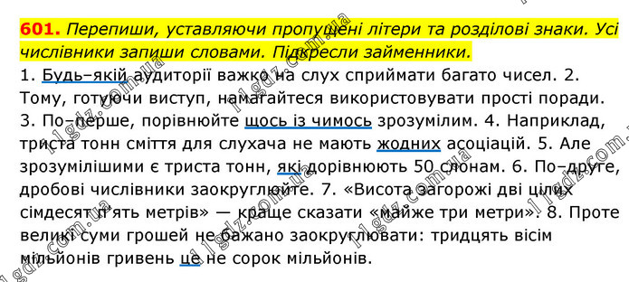 Перепиши, уставляючи пропущені літери та розділові знаки. Усі числівники запиши словами. Підкресли займенники. 1. Будь–якій аудиторії важко на слух сприймати багато чисел. 2. Тому, готуючи виступ, намагайтеся використовувати прості поради. 3. По–перше, порівнюйте щось із чимось зрозумілим. 4. Наприклад, триста тонн сміття для слухача не мають жодних асоціацій. 5. Але зрозумілішими є триста тонн, які дорівнюють 50 слонам. 6. По–друге, дробові числівники заокруглюйте. 7. «Висота загорожі дві цілих сімдесят п'ять метрів» — краще сказати «майже три метри». 8. Проте великі суми грошей не бажано заокруглювати: тридцять вісім мільйонів гривень це не сорок мільйонів.
