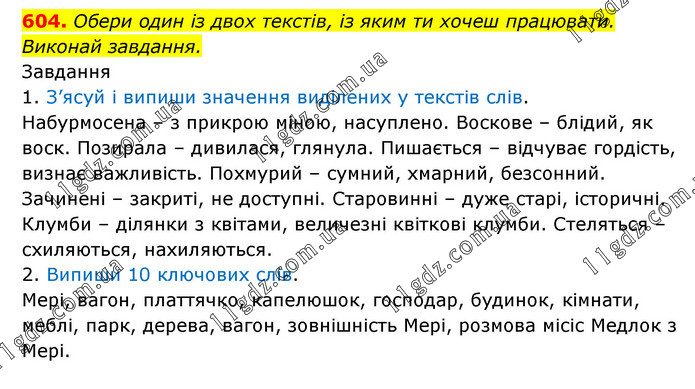 Обери один із двох текстів, із яким ти хочеш працювати. Виконай завдання. Завдання 1. З’ясуй і випиши значення виділених у текстів слів. Набурмосена – з прикрою міною, насуплено. Воскове – блідий, як воск. Позирала – дивилася, глянула. Пишається – відчуває гордість, визнає важливість. Похмурий – сумний, хмарний, безсонний. Зачинені – закриті, не доступні. Старовинні – дуже старі, історичні. Клумби – ділянки з квітами, величезні квіткові клумби. Стеляться – схиляються, нахиляються. 2. Випиши 10 ключових слів. Мері, вагон, платтячко, капелюшок, господар, будинок, кімнати, меблі, парк, дерева, вагон, зовнішність Мері, розмова місіс Медлок з Мері.