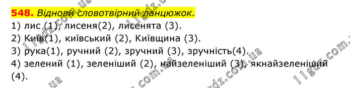 Віднови словотвірний ланцюжок. 1) лис (1), лисеня(2), лисенята (3). 2) Київ(1), київський (2), Київщина (3). 3) рука(1), ручний (2), зручний (3), зручність(4). 4) зелений (1), зеленіший (2), найзеленіший (3), якнайзеленіший (4).