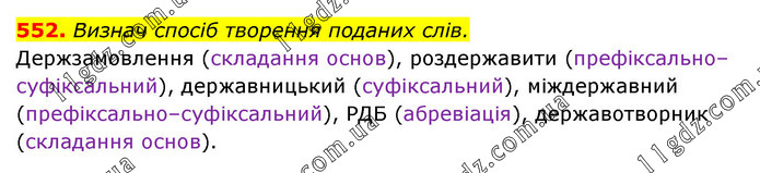 Визнач спосіб творення поданих слів. Держзамовлення (складання основ), роздержавити (префіксально–суфіксальний), державницький (суфіксальний), міждержавний (префіксально–суфіксальний), РДБ (абревіація), державотворник (складання основ).