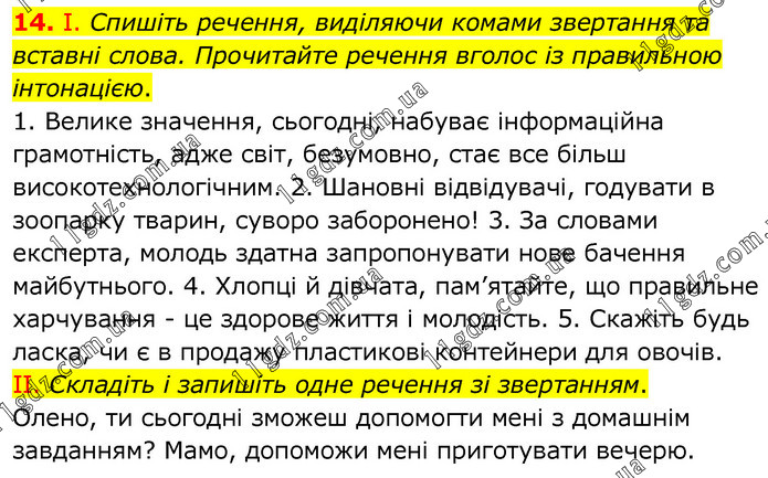 І. Спишіть речення, виділяючи комами звертання та вставні слова. Прочитайте речення вголос із правильною інтонацією. 1. Велике значення, сьогодні, набуває інформаційна грамотність, адже світ, безумовно, стає все більш високотехнологічним. 2. Шановні відвідувачі, годувати в зоопарку тварин, суворо заборонено! 3. За словами експерта, молодь здатна запропонувати нове бачення майбутнього. 4. Хлопці й дівчата, пам’ятайте, що правильне харчування - це здорове життя і молодість. 5. Скажіть будь ласка, чи є в продажу пластикові контейнери для овочів. II. Складіть і запишіть одне речення зі звертанням. Олено, ти сьогодні зможеш допомогти мені з домашнім завданням? Мамо, допоможи мені приготувати вечерю.