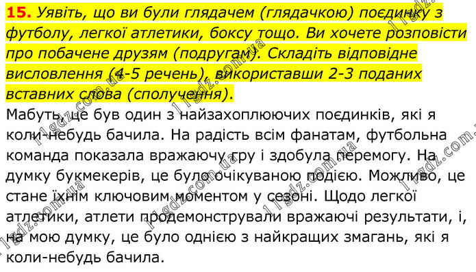 Уявіть, що ви були глядачем (глядачкою) поєдинку з футболу, легкої атлетики, боксу тощо. Ви хочете розповісти про побачене друзям (подругам). Складіть відповідне висловлення (4-5 речень), використавши 2-3 поданих вставних слова (сполучення). Мабуть, це був один з найзахоплюючих поєдинків, які я коли-небудь бачила. На радість всім фанатам, футбольна команда показала вражаючу гру і здобула перемогу. На думку букмекерів, це було очікуваною подією. Можливо, це стане їхнім ключовим моментом у сезоні. Щодо легкої атлетики, атлети продемонстрували вражаючі результати, і, на мою думку, це було однією з найкращих змагань, які я коли-небудь бачила.