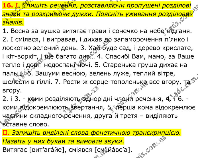 І. Спишіть речення, розставляючи пропущені розділові знаки та розкривючи дужки. Поясніть уживання розділових знаків. 1. Весна за вушка витягає трави і сонечко на небо підганя. 2. І сміявся, і вигравав, і дихав до запаморочення п’янко і лоскотно зелений день. 3. Хай буде сад, і дерево крислате, і кіт-воркіт, і ще багато див… 4. Спасибі Вам, мамо, за Ваше тепло і довгі недоспані ночі. 5. Старенька груша дихає на пальці. 6. Зашуми весною, зелень луже, теплий вітре, шелести в гіллі. 7. Рости ж серце-тополенько все вгору, та вгору. 2. і 3. - коми розділяють однорідні члени речення, 4. і 6. - коми відокремлюють звертання, 5. перша кома відокремлює частини складного речення, друга й третя – виділяють вставне слово. ІІ. Запишіть виділені слова фонетичною транскрипцією. Назвіть у них букви та вимовте звуки. Витягає [вит’ага́йе], сміявся [см’ійа́вс’а].