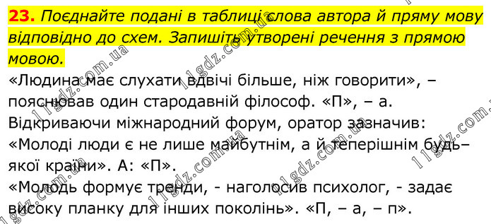 Поєднайте подані в таблиці слова автора й пряму мову відповідно до схем. Запишіть утворені речення з прямою мовою. «Людина має слухати вдвічі більше, ніж говорити», – пояснював один стародавній філософ. «П», – а. Відкриваючи міжнародний форум, оратор зазначив: «Молоді люди є не лише майбутнім, а й теперішнім будь–якої країни». А: «П». «Молодь формує тренди, - наголосив психолог, - задає високу планку для інших поколінь». «П, – а, – п».