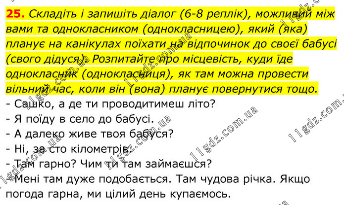 Складіть і запишіть діалог (6-8 реплік), можливий між вами та однокласником (однокласницею), який (яка) планує на канікулах поїхати на відпочинок до своєї бабусі (свого дідуся). Розпитайте про місцевість, куди їде однокласник (однокласниця), як там можна провести вільний час, коли він (вона) планує повернутися тощо. - Сашко, а де ти проводитимеш літо? - Я поїду в село до бабусі. - А далеко живе твоя бабуся? - Ні, за сто кілометрів. - Там гарно? Чим ти там займаєшся? - Мені там дуже подобається. Там чудова річка. Якщо погода гарна, ми цілий день купаємось.