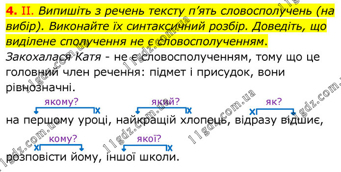 Випишіть з речень тексту п’ять словосполучень (на вибір). Виконайте їх синтаксичний розбір. Доведіть, що виділене сполучення не є словосполученням. Закохалася Катя - не є словосполученням, тому що це головний член речення: підмет і присудок, вони рівнозначні.