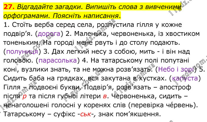 Відгадайте загадки. Випишіть слова з вивченими орфограмами. Поясніть написання. 1. Стоїть верба серед села, розпустила гілля у кожне подвір’я. (дорога) 2. Маленька, червоненька, із хвостиком тоненьким. На городі мене рвуть і до столу подають. (полуниця) 3. Дах легкий несу з собою, мить - і він над головою. (парасолька) 4. На татарському полі попутані коні, вузлики знать, та не можна розв’язать. (Небо і зорі) 5. Сидить баба на грядках, вся закутана в хустках. (капуста) Гілля – подвоєні букви. Подвір’я, розв’язать – апостроф після р та після губної літери в. Червоненька, сидить – ненаголошені голосні у коренях слів (перевірка че́рвень). Татарському – суфікс -ськ-, знак пом’якшення.