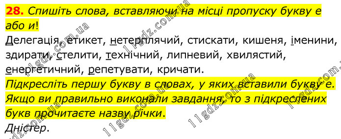 Спишіть слова, вставляючи на місці пропуску букву е або и! Делегація, етикет, нетерплячий, стискати, кишеня, іменини, здирати, стелити, технічний, липневий, хвилястий, енергетичний, репетувати, кричати. Підкресліть першу букву в словах, у яких вставили букву е. Якщо ви правильно виконали завдання, то з підкреслених букв прочитаєте назву річки. Дністер.