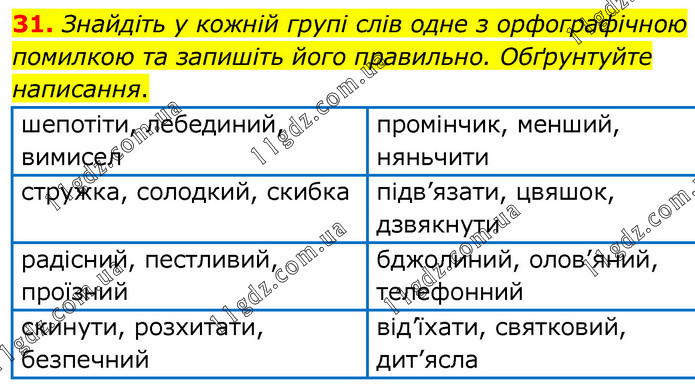 Знайдіть у кожній групі слів одне з орфографічною помилкою та запишіть його правильно. Обґрунтуйте написання. шепотіти, лебединий, вимисел промінчик, менший, няньчити стружка, солодкий, скибка підв’язати, цвяшок, дзвякнути радісний, пестливий, проїзний бджолиний, олов’яний, телефонний скинути, розхитати, безпечний від’їхати, святковий, дит’ясла