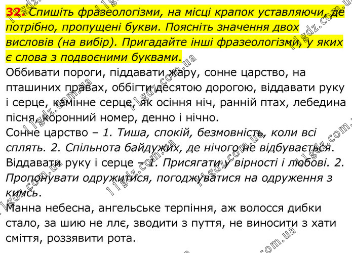 Спишіть фразеологізми, на місці крапок уставляючи, де потрібно, пропущені букви. Поясніть значення двох висловів (на вибір). Пригадайте інші фразеологізми, у яких є слова з подвоєними буквами. Оббивати пороги, піддавати жару, сонне царство, на пташиних правах, оббігти десятою дорогою, віддавати руку і серце, камінне серце, як осіння ніч, ранній птах, лебедина пісня, коронний номер, денно і нічно. Сонне царство – 1. Тиша, спокій, безмовність, коли всі сплять. 2. Спільнота байдужих, де нічого не відбувається. Віддавати руку і серце – 1. Присягати у вірності і любові. 2. Пропонувати одружитися, погоджуватися на одруження з кимсь. Манна небесна, ангельське терпіння, аж волосся дибки стало, за шию не ллє, зводити з пуття, не виносити з хати сміття, роззявити рота.