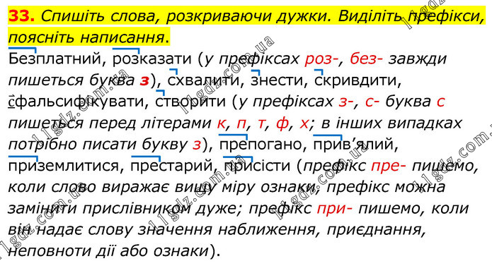Спишіть слова, розкриваючи дужки. Виділіть префікси, поясніть написання. Безплатний, розказати (у префіксах роз-, без- завжди пишеться буква з), схвалити, знести, скривдити, с ⃑фальсифікувати, створити (у префіксах з-, с- буква с пишеться перед літерами к, п, т, ф, х; в інших випадках потрібно писати букву з), препогано, прив’ялий, приземлитися, престарий, присісти (префікс пре- пишемо, коли слово виражає вищу міру ознаки, префікс можна замінити прислівником дуже; префікс при- пишемо, коли він надає слову значення наближення, приєднання, неповноти дії або ознаки).