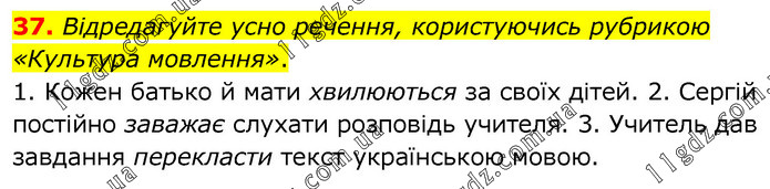Відредагуйте усно речення, користуючись рубрикою «Культура мовлення». 1. Кожен батько й мати хвилюються за своїх дітей. 2. Сергій постійно заважає слухати розповідь учителя. 3. Учитель дав завдання перекласти текст українською мовою.